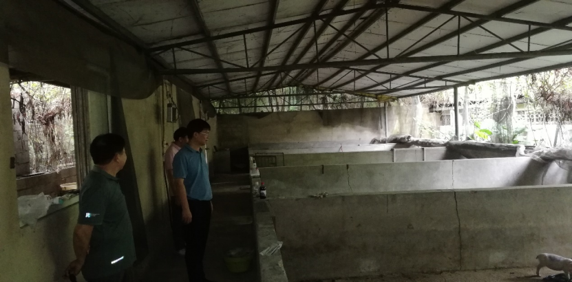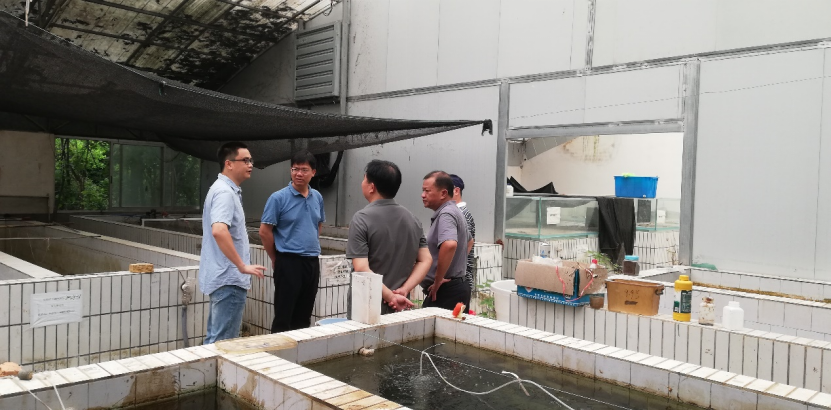 党委书记韦小强(左二)检查公司水产教学科研基地养殖大棚