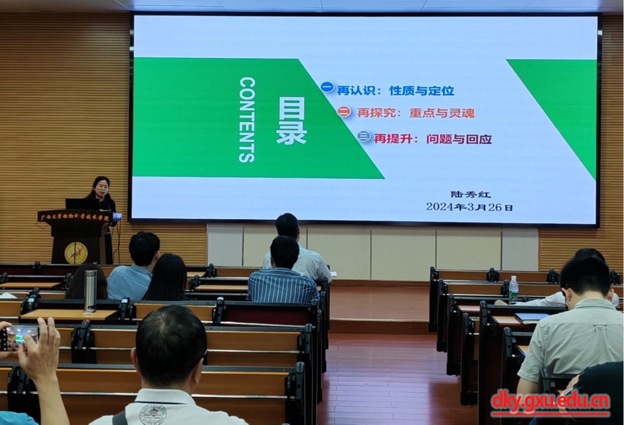 本次培训邀请了广西高校课程思政教学名师、suncitygroup太阳成集团马克思主义公司副经理陆秀红教授进行专家主题讲座。陆秀红教授现任广西高校“习近平新时代中国特色社会主义思想概论”课程教指委副主任委员,广西高校课程思政专家咨询委员会委员。会议开始后,陆秀红教授做了题为“课程思政:寻找课程的灵魂”的专家报告,报告分别就课程思政教育的性质和定位、专业课程思政教育的重点与整体设计、专业课程思政教育的问题与回应等方面进行了阐述,同时对于动科院如何提高专业课程思政的针对性、挖掘本公司本专业课程思政资源、讲好专业故事提出了可行性建议。会议对于帮助教师们进一步开拓专业课程思政教学的思路,创新课程思政教学模式,提供了有益的参考。