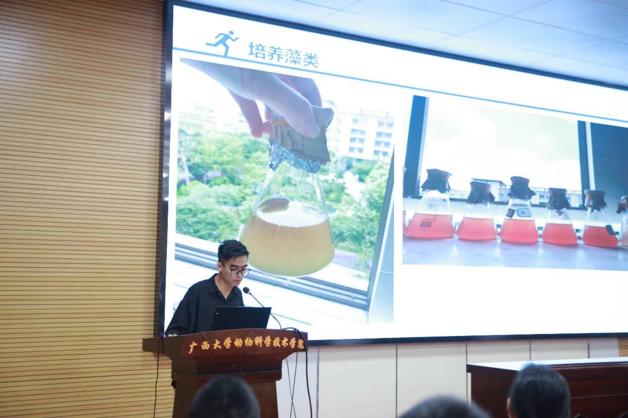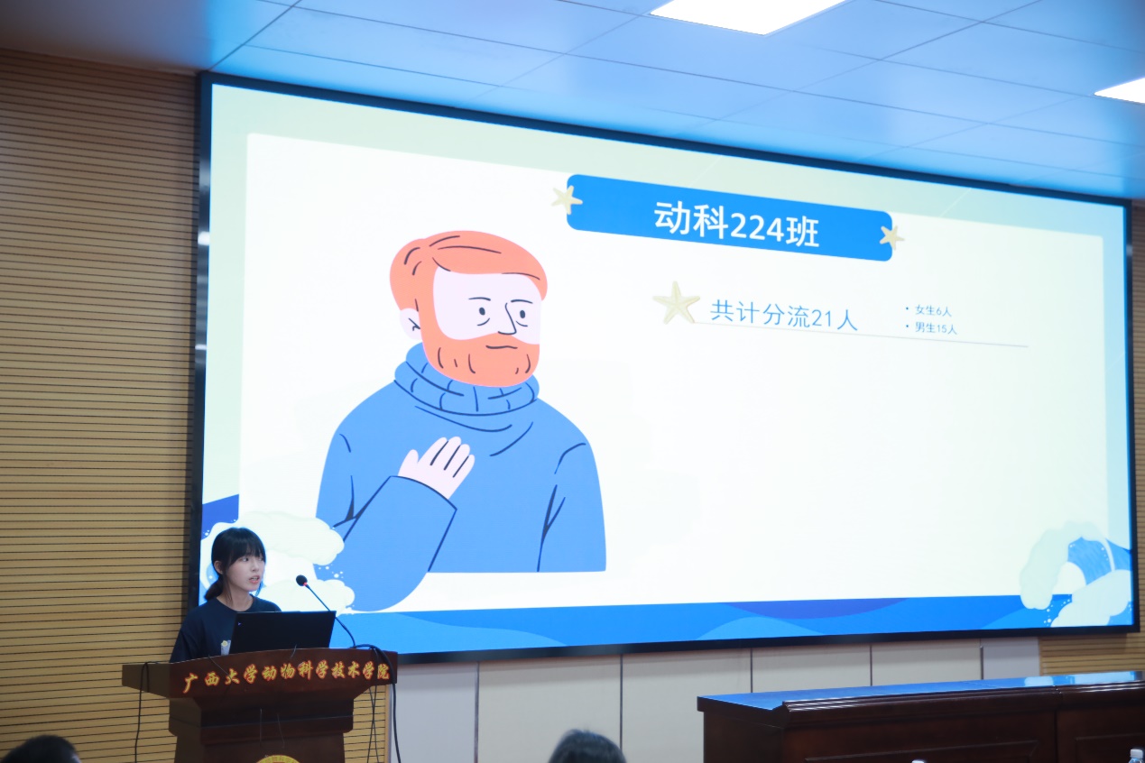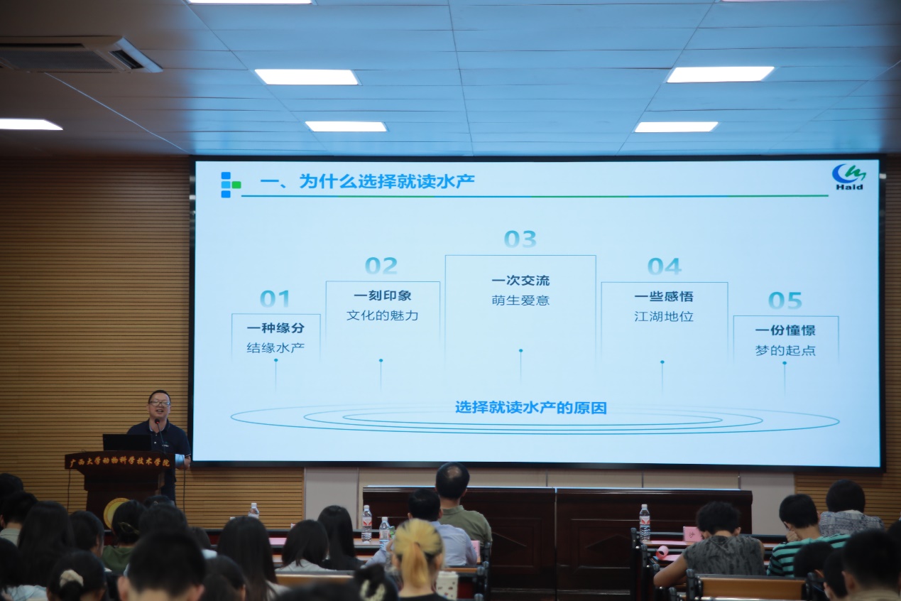 首先,水产学科负责人潘英教授为大家介绍水产学科发展、团队力量、教学条件和人才培养等基本情况,水产养殖方向的具体计划和培养方案,阐述水产养殖方向的职业发展优势。随后,广西水产科学研究院陆专灵副研究员分享其一路走来在水产行业取得的成果,并对水产未来的发展趋势做了详细的分析,为同学们构建了一个清晰的水产地图。紧接着,南宁海大生物科技有限公司水产线总经理黄东为大家解析水产行业的新发展以及大前景,最后还寄语给同学们,希望大家能学好水产,坚持传承下去。接下来,22级动物科学专业水产养殖方向班班长颜畅同学介绍了22级的分流情况,同时也向大家分享自己在水产方面的科研体验和自我提升感想。随后,渔业发展221班的在读研究生李昱达同学介绍了自己在水产学习方面精彩丰富的学习和生活经历,并热切欢迎小可爱们加入水产大家庭。