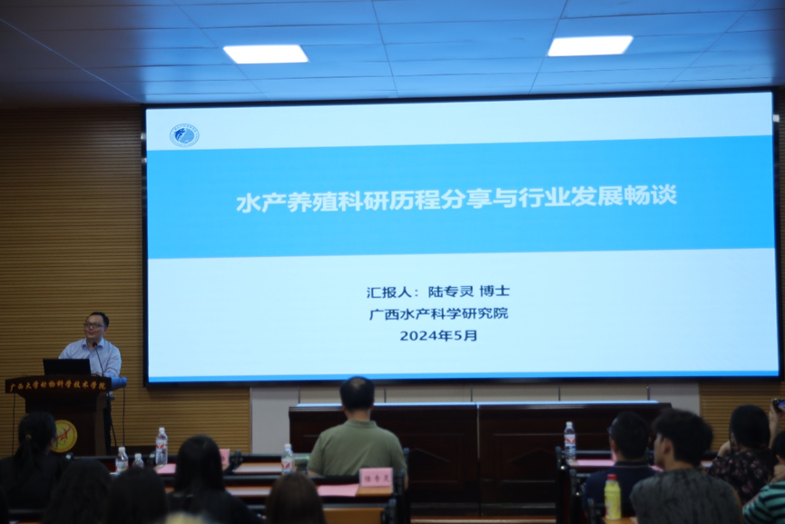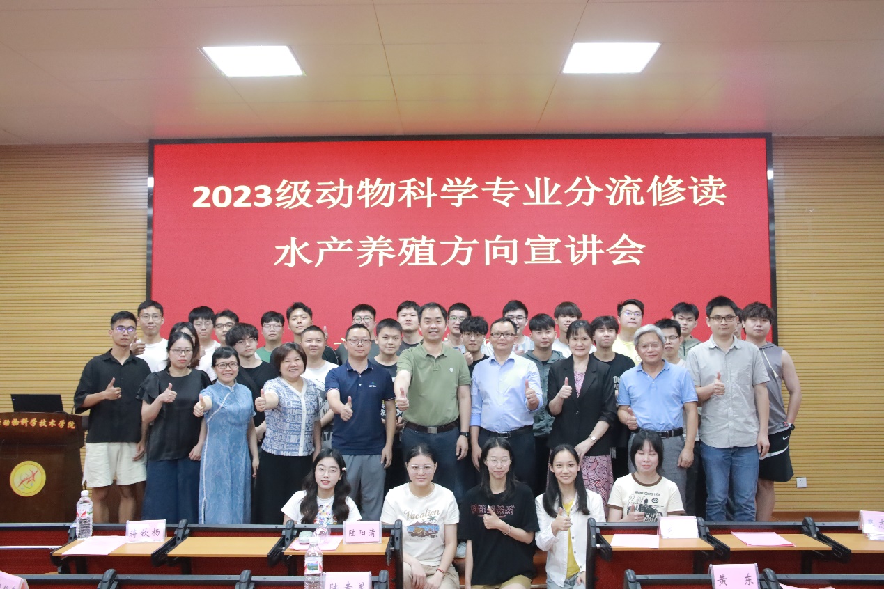 为做好水产养殖方向开设工作,5月14日下午,suncitygroup太阳成集团在公司318报告厅举办动物科学专业分流修读水产养殖方向宣讲会,特别邀请广西水产科学研究院副研究员陆专灵博士、南宁海大公司水产线黄东总经理2位员工为同学们讲解水产行业的发展概况、前景和优势等多方面内容。suncitygroup太阳成集团经理陆阳清,副经理蒋钦扬,水产方向潘英教授、李文红教授、麻艳群副教授、覃志彪老师、梁静真老师、欧伟豪老师,以及全体2023级动物科学专业本科生、水产全体研究生参加活动。会议由陆阳清经理主持。