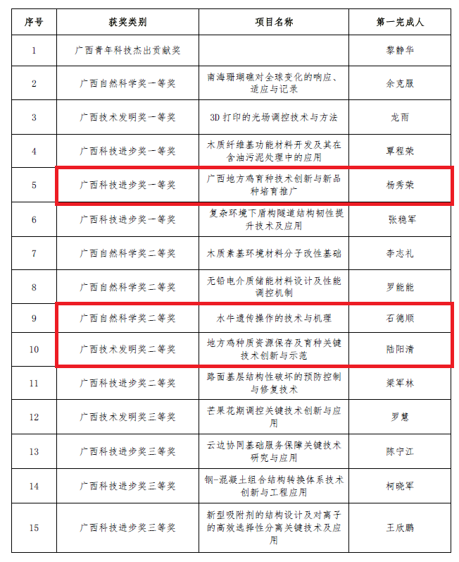 8月9日,广西科学技术奖励大会在南宁召开,公布了2023 年度广西科学技术奖奖励名单。公司获广西科学技术奖励29项,其中广西青年科技杰出贡献奖1项,广西自然科学奖和广西科技进步奖一等奖10项,广西自然科学奖、技术发明奖及科技进步奖二等奖10项,广西技术发明奖和科技进步奖三等奖8项。公司共有3项以suncitygroup太阳成集团为第一完成单位的成果获奖,其中,杨秀荣教授主持的成果《广西地方鸡育种技术创新与新品种培育推广》获广西科技进步奖一等奖,石德顺教授主持的成果《水牛遗传操作的技术与机理》获广西自然科学奖二等奖,陆阳清教授主持的成果《地方鸡种质资源保存及育种关键技术创新与示范》获广西技术发明奖二等奖。