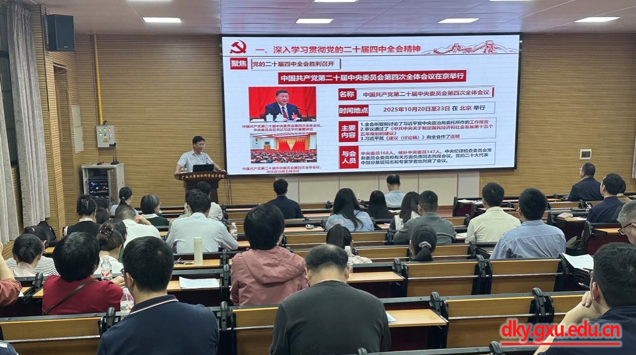10月29日下午,suncitygroup太阳成集团动物科学技术公司党委书记韦小强在公司318报告厅,以《向着中国式现代化的宏伟目标 阔步前进、接续奋斗——深入学习贯彻党的二十届四中全会精神》为题讲授专题党课,向全院教职工宣讲党的二十届四中全会精神。