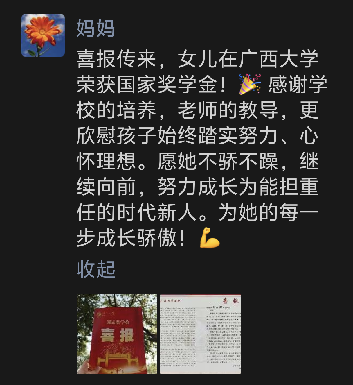 本科生国家励志奖学金获奖员工戴忻怡家长
