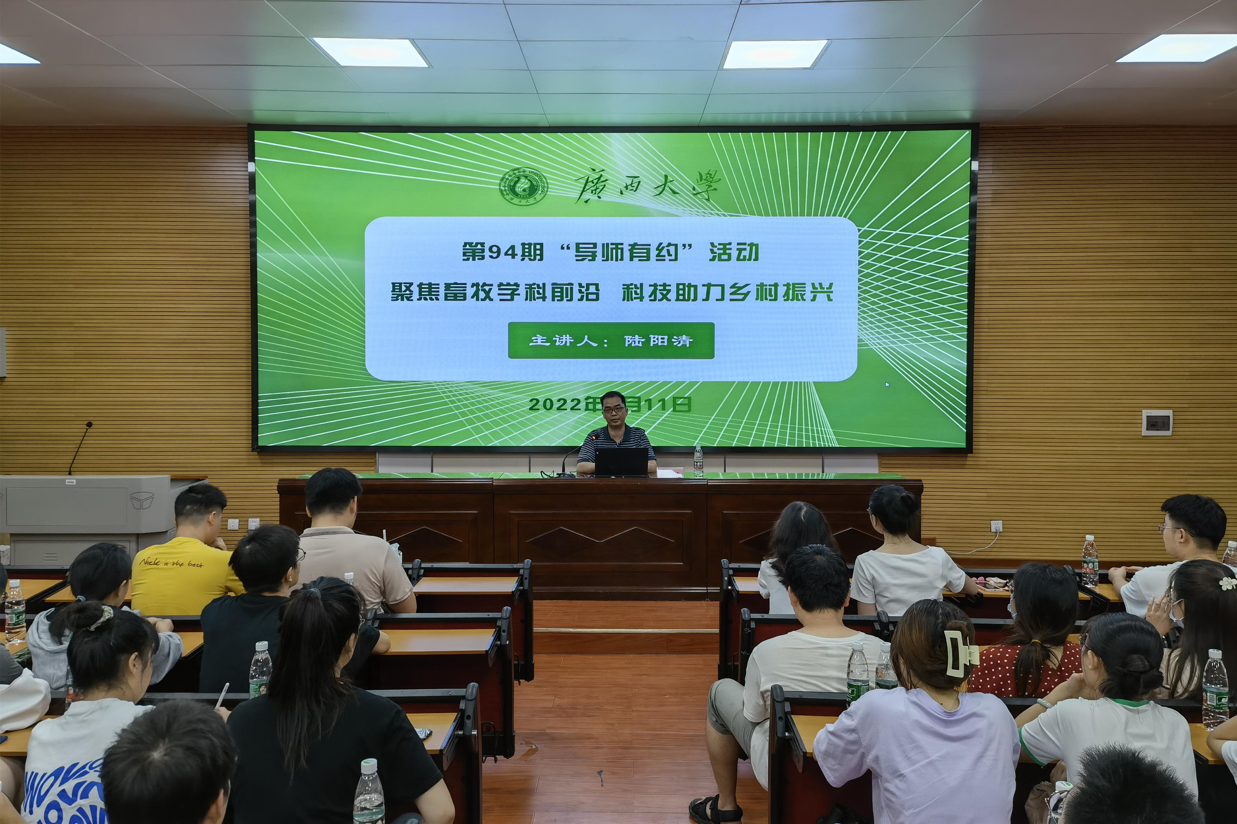 6月11日晚上,suncitygroup太阳成集团第94期“导师有约”活动在suncitygroup太阳成集团318报告厅举行,主题为“聚焦畜牧学科前沿,科技助力乡村振兴”,suncitygroup太阳成集团常务副经理、教授、博士生导师陆阳清受邀主讲。suncitygroup太阳成集团团委副书记刘诚,以及2021级畜牧学、畜牧专业全体硕士生参加此次活动。