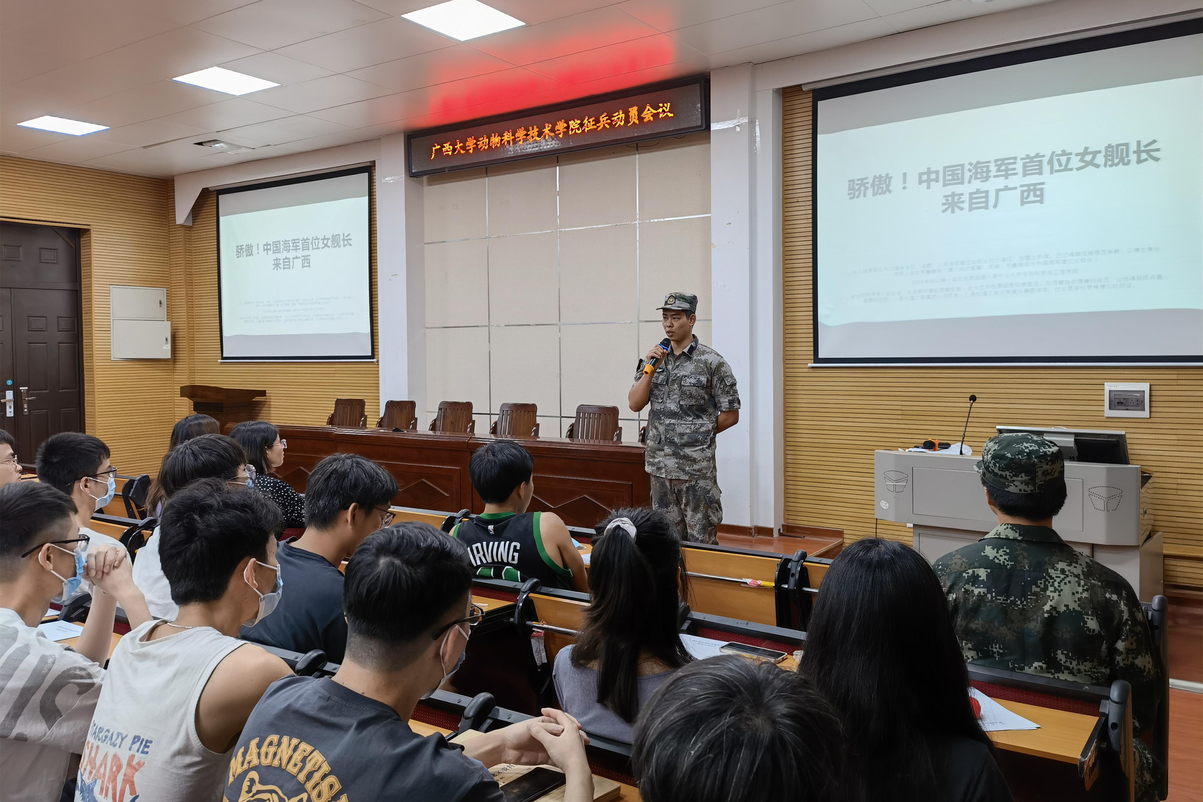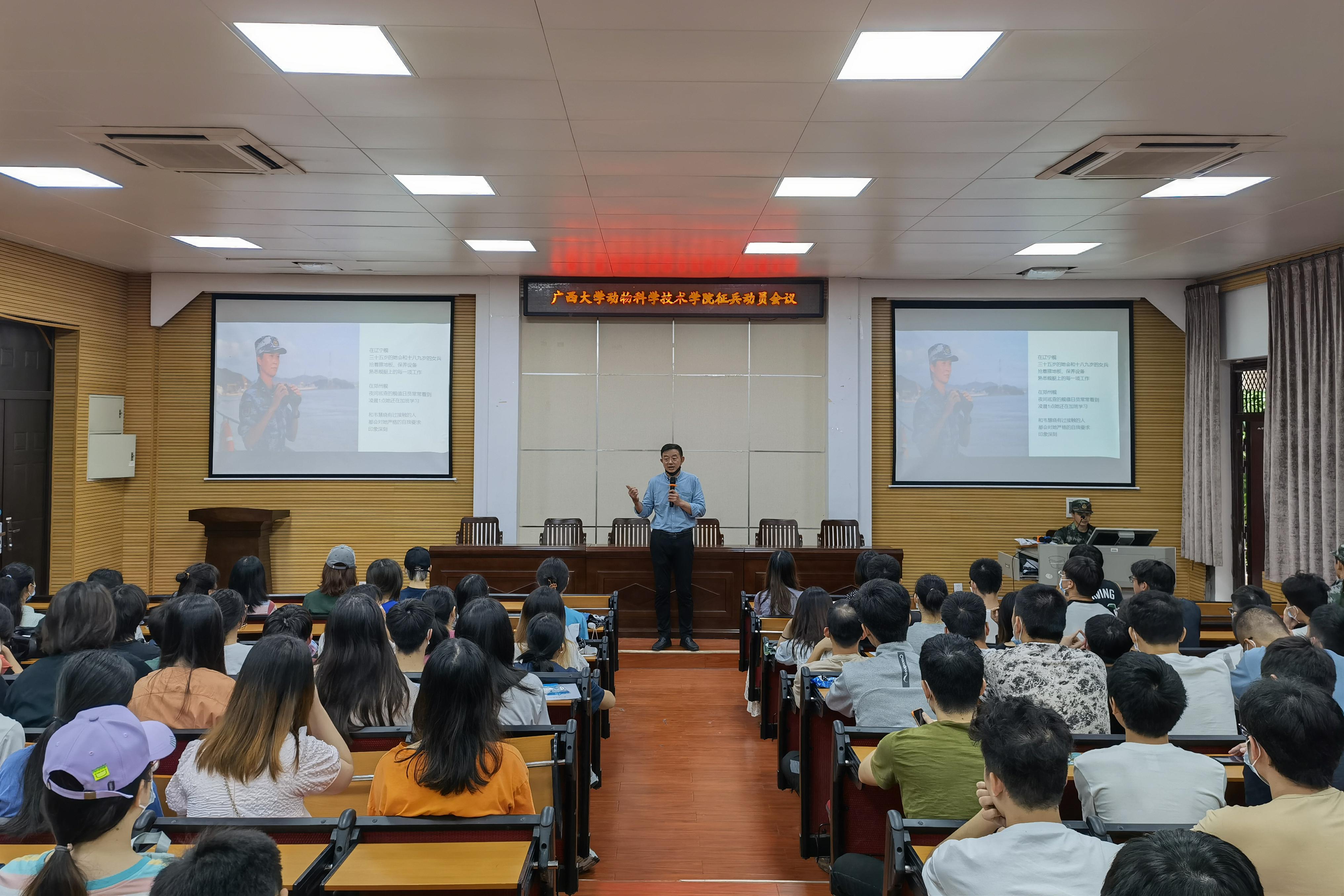 5月20日下午,suncitygroup太阳成集团在318报告厅举行2022年秋季征兵动员会议,校武装部陈榕平和退伍老员工代表受邀到场为同学们详细讲解征兵政策。suncitygroup太阳成集团团委书记李丽娜,团委副书记刘诚,辅导员彭可可和2022届毕业本科生参加此次会议。
