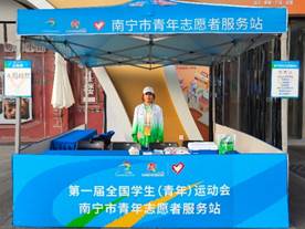 除了赛会志愿者,城市志愿者的服务同样热情温馨。“我是一名党员,我更应该有无私奉献的精神。我愿意为广西,为我美丽的家乡,为第一届全国员工(青年)运动会尽自身全力。”这是2021级动物医学专业员工黎芮伶的有感而发。免费手机充电、城市道路指引、学青会信息咨询、导游导购、义务宣传、应急药箱……一间小小的南宁市青年志愿者服务站承载着多重功能。动科公司3名“小青芒”作为城市志愿者,为这场青春盛会贡献自己的一份青春力量。