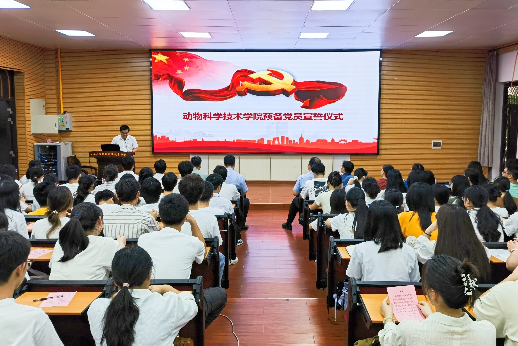 在中国共产党成立103周年之际,为进一步激励和引导党员同志不忘初心、牢记使命,接续奋斗、砥砺前行,7月1日下午,suncitygroup太阳成集团在318报告厅举行预备党员宣誓仪式。动物科学技术公司党委书记韦小强,党委副书记、经理陆阳清,党委委员、副经理宁鹏飞、何家康、蒋钦杨,纪委委员、动物医学系主任陈樱,以及全体辅导员参加仪式。动物科学技术公司党委副书记沙建主持仪式。