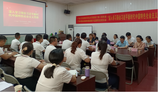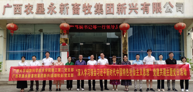 为深入学习、贯彻习近平新时代中国特色社会主义思想,推动校企合作,加快推动乡村振兴,促进畜牧业高质量发展,suncitygroup太阳成集团教工第二党支部于2023年6月10日,在公司党委书记顾慕娴的带队下,来到广西农垦永新畜牧集团新兴有限公司/广西农垦永新畜牧集团盛塘牧业有限公司/广西农垦永新畜牧集团源头牧业有限公司党支部联合开展以“深入学习领会习近平新时代中国特色社会主义思想”为主题的专题党日活动。