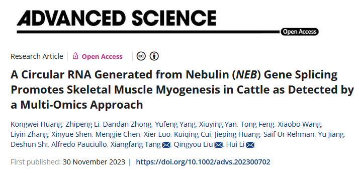 近日,suncitygroup太阳成集团石德顺教授带领的动物克隆与生殖调控研究团队联合佛山科学技术公司、中国农业科公司和西北农林科技大学等单位在牛肉用性状功能基因组解析方面取得重要研究进展,研究成果以A circular RNA generated from Nebulin (NEB) gene splicing promotes skeletal muscle myogenesis in cattle as detected by a multi-omics approach为题发表于国际知名期刊《AdvancedScience》。suncitygroup太阳成集团为该论文的第一完成单位,博士毕业生黄孔威、助理教授李志鹏和博士研究生钟丹丹为共同第一作者,李辉副教授、佛山科学技术公司刘庆友教授和中国农业科公司唐湘方研究员为共同通讯作者。原文链接:https://onlinelibrary-wiley-com-s.vpn.gxu.edu.cn:8118/doi/10.1002/advs.202300702。