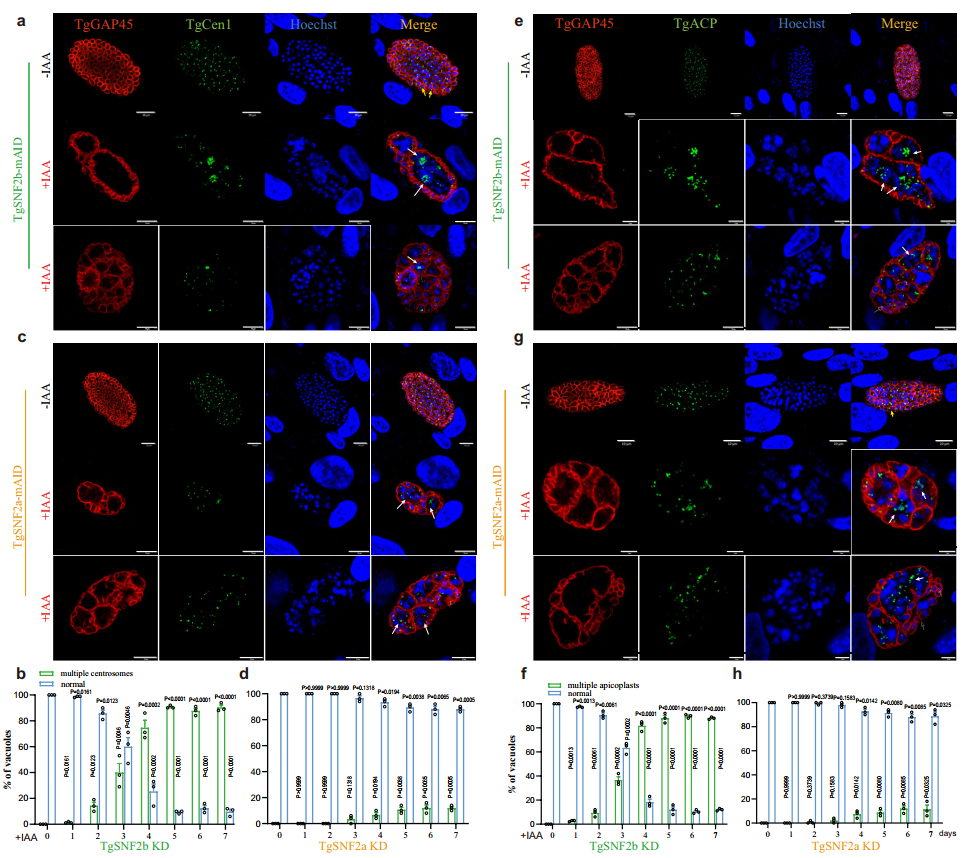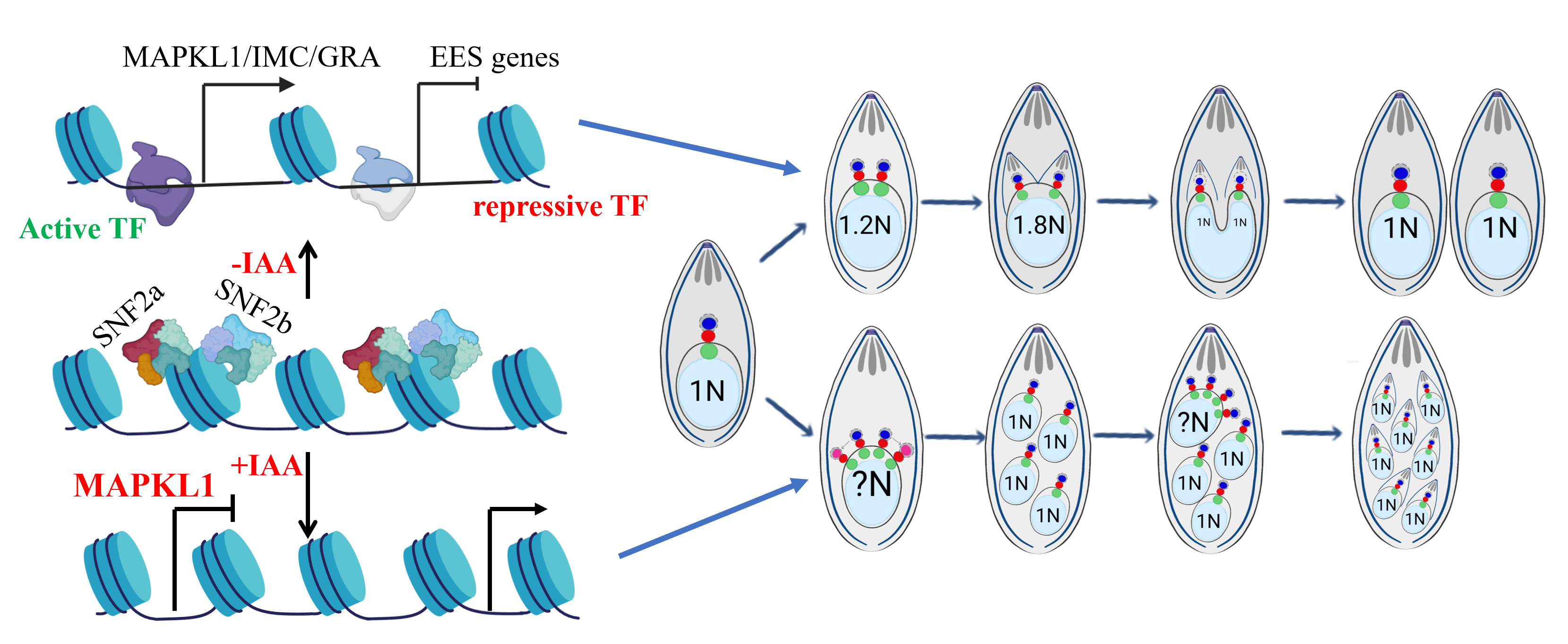 本研究通过“生长素诱导的降解”技术,构建了SWI/SNF染色质重塑复合体核心亚基的条件性敲低虫株,探究了该复合体在弓形虫速殖子阶段的功能。研究表明,SWI/SNF复合体是维持寄生虫正常生长和分裂模式所必需的“激活器”。抑制该复合体功能,会导致寄生虫分裂模式从有序的“一分为二”变为异常的“一分为多”,并错误表达其他发育阶段的基因。弓形虫SWI/SNF复合体通过维持速殖子特异性基因的染色质开放性,并与“抑制器”MORC协同,实现对基因表达的“双重门控”,从而精确维持寄生虫的“身份”。这些发现阐明了弓形虫生命周期调控的关键机制,为开发新型抗弓形虫病药物提供了一种全新、高效的策略,也为寄生虫表观遗传学研究提供了重要的理论依据。