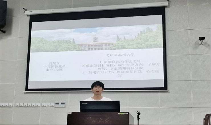 肖旭全同志成功考取苏州大学的硕士研究生,他给同学们提出了三点建议,一是明确自己为什么考研,只有这样才能更为坚定的备考,不会动摇;二是确定专业方向,了解目标院校的分数线等相关的信息,知己知彼才能百战不殆;三是制定合理计划,保证充足休息,心态稳定。
