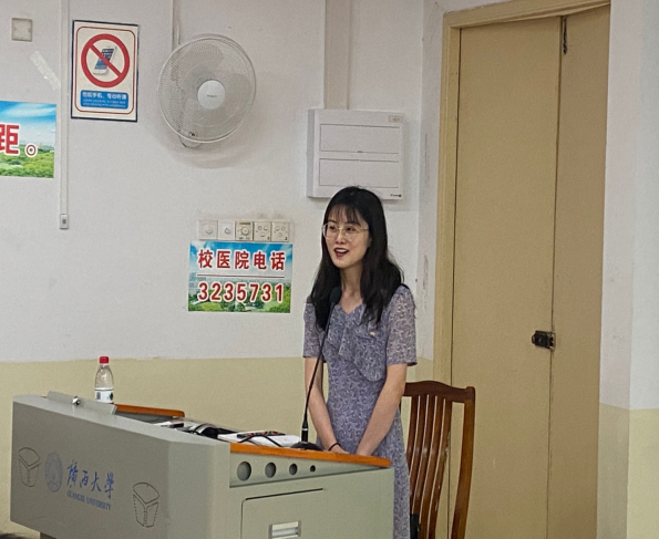 韦义荣同志作为考研、求职两手抓的同学代表,分享了她求职及考研复习两不误的心得,强调了大学初期制定好大学规划和目标的重要意义。韦义荣特别强调加入员工组织锻炼各方面能力、提高综合素质对于求职和升学的重要性,并详细介绍面试、签约等事宜。最后她向同学们寄语:“人生没有捷径,确立目标,严于律己,求学若渴,发挥优势才是成功的试金石。”