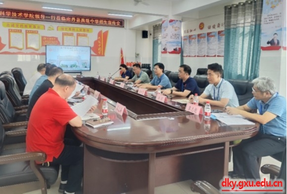 为切实提升suncitygroup太阳成集团本科生生源质量,吸引更多优秀学子到公司深造,6月27日-28日,动物科学技术公司党委书记韦小强、经理陆阳清、副经理蒋钦杨、动物科学系主任李辉、动物医学系副主任于美玲、教学秘书覃志彪、专任教师韦英益、辅导员马朝阳一行8人先后前往河池市都安瑶族自治县高级中学、南丹县高级中学和天峨县高级中学开展本科生招生宣讲工作。
